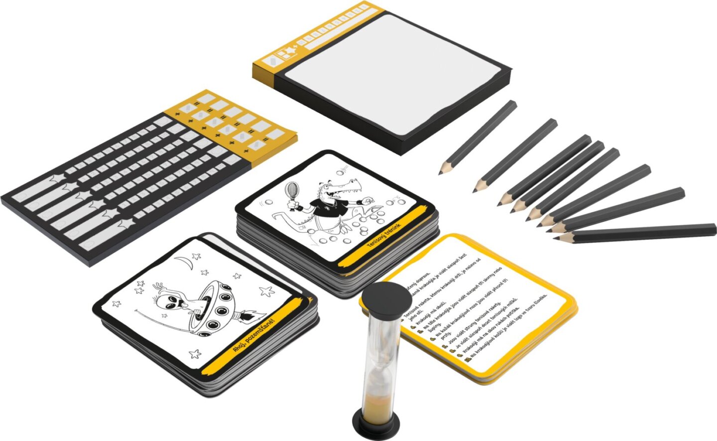 design komponent zaručuje snadnou přípravu i skladování, takže si hru snadno vezmete s sebou kamkoliv. Obsah balení: 6 tužek 1 kreslicí bloček 1 přesýpací hodiny 120 karet obrázků 1 bodovací bloček česká a slovenská pravidla