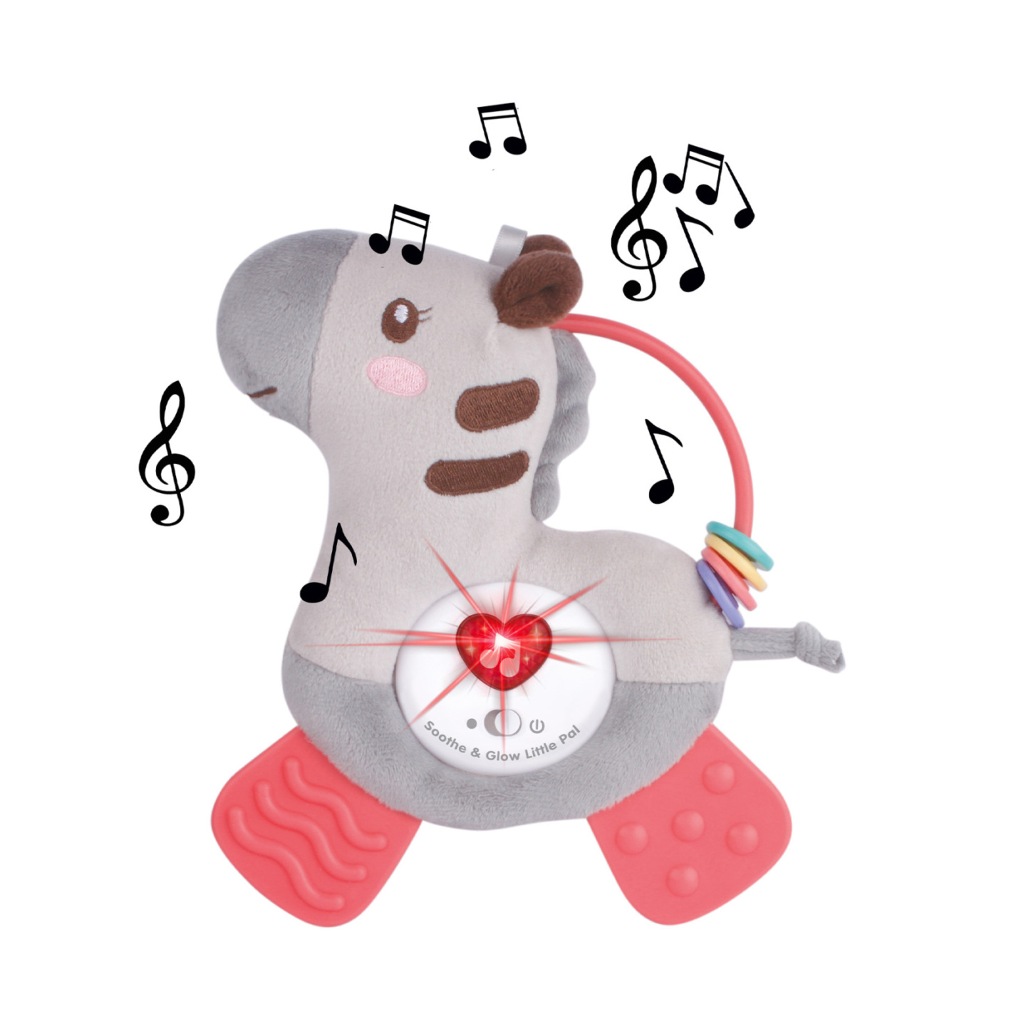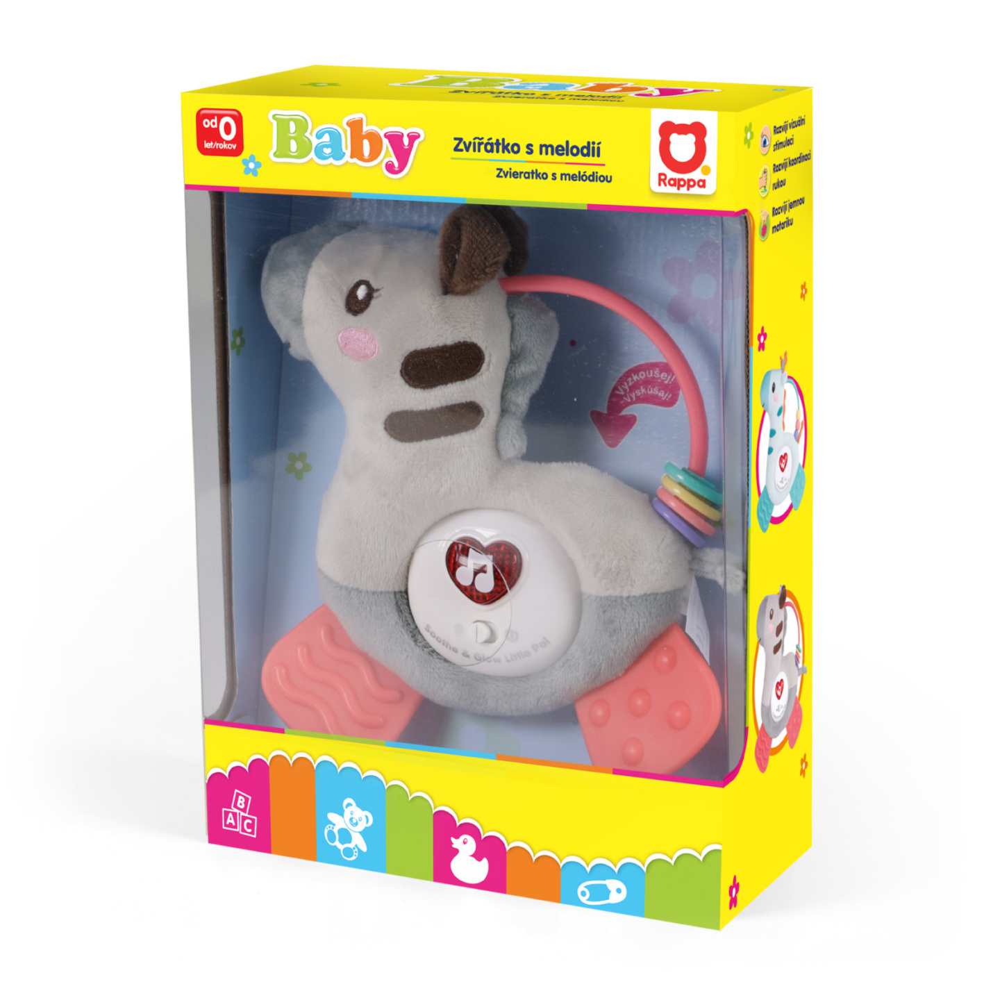Veselé plyšové kousátko - zebra pro naše nejmenší děti. Při stisknutí barevně bliká a vydává zvuky. Hračka rozvíjí smyslové vnímání dítěte a podněcuje jeho fantazii. Hračka funguje na 3 baterie typu AG13, které jsou součástí výrobku. Přiložen i praktický klip na uchycení do...