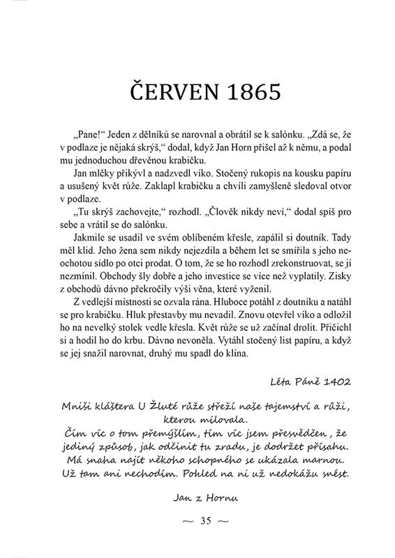 Zjistil, co se neměl dozvědět. Pocit křivdy mu pronikl pod kůži jako otrávený šíp. Přesto by ho to nikdy nenapadlo, kdyby neprošla těmi dveřmi. Pak už tu myšlenku nedokázal dostat z hlavy. Jenže touha po zakázaném bývá zrádná. Rok 1380. Mečíř Petr a šlechtická dcera Anna se navzdory osudu...