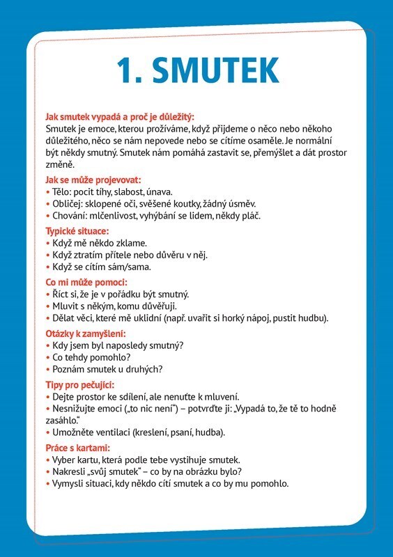 Jedinečná sada 32 emočních karet je určena pro práci s dospívajícími a dospělými, zejména v oblasti rozvoje emoční inteligence, sebepoznání a sociálních dovedností. Pomůcka je vhodná pro terapeuty, pedagogy, rodiče i samotné klienty – včetně osob s poruchou autistického spektra...