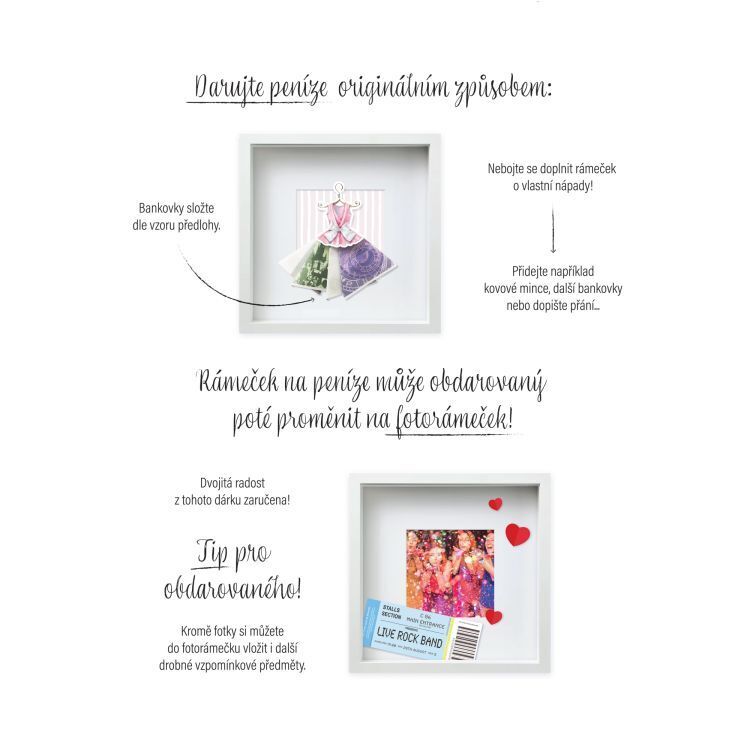 Dárkové fotorámečky na peníze jsou nejen originálním způsobem, jak darovat peníze, ale poslouží i jako klasické rámečky. Rozměry: 23 × 23 × 5,5 cm