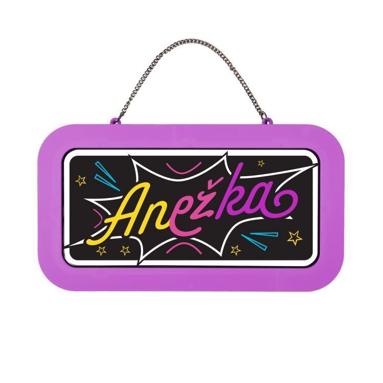 Originální svítící neonová cedulka se jménem. Snadno ji kamkoli postavíte nebo zavěsíte, funguje totiž na baterie. Rozměry cedulky: 18,7 × 10,3 cm Baterie: 2 × AAA (jsou součástí balení)