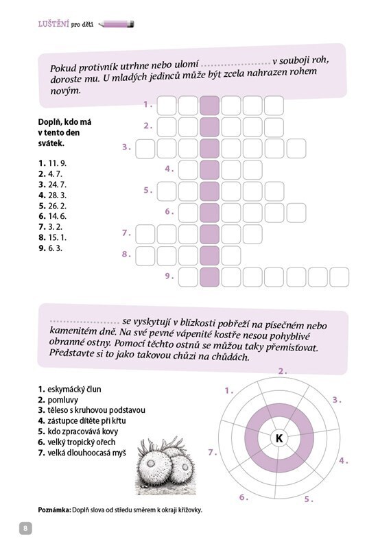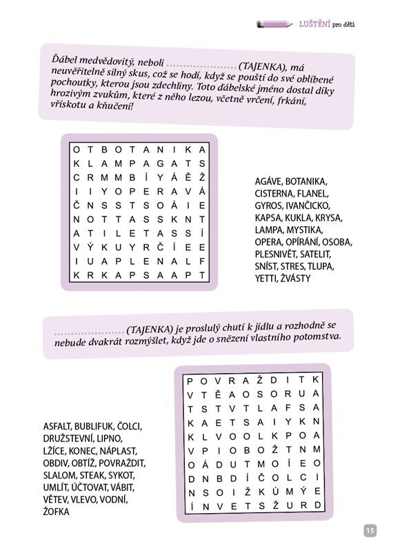 Křížovky, osmisměrky, sudoku či spojovačky a k tomu navíc spousta překvapivých informací o zvířatech. Víš, které zvíře má ocas plný jedovatých trnů? Tušíš, kterému živočichovi se přezdívá ďábelská ryba? Pokud ne, je čas se to dozvědět. Roztoč mozkové závity a pusť se do toho! Hesla v křížovkách...