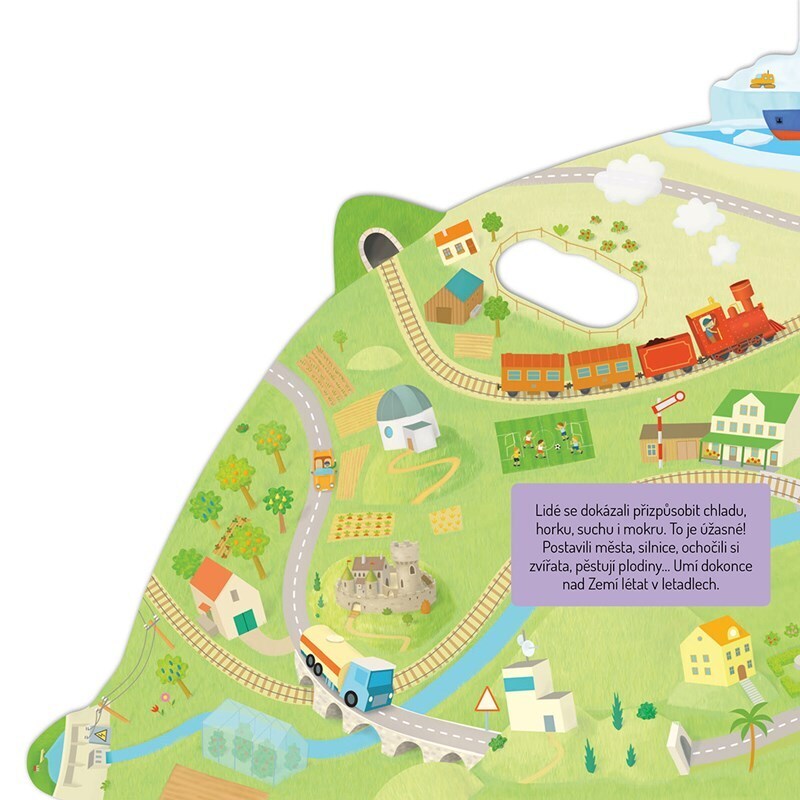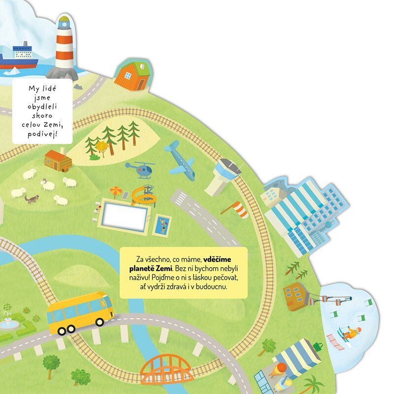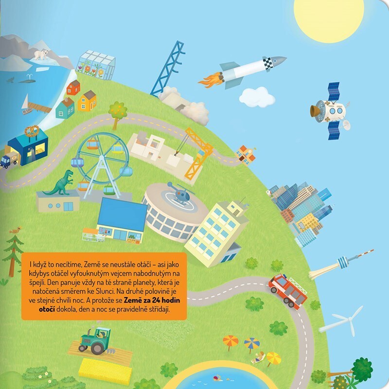 Jak se jmenuje planeta, na které žijeme? No jasně, Země! Ale jak vlastně vypadá? A co je zač? Pojď se na ni podívat pěkně z výšky. Otáčej tvarovanými stránkami a zjisti, co jsou to oceány a světadíly, jaké počasí na Zemi panuje, kde žijí žirafy a kde lední medvědi, jak podobu Země ovlivňují lidé...