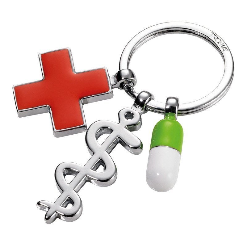 Troika klíčenka - červený kříž, pilulka, Aeskulapova hůl Get well (kovová, mix barev)
