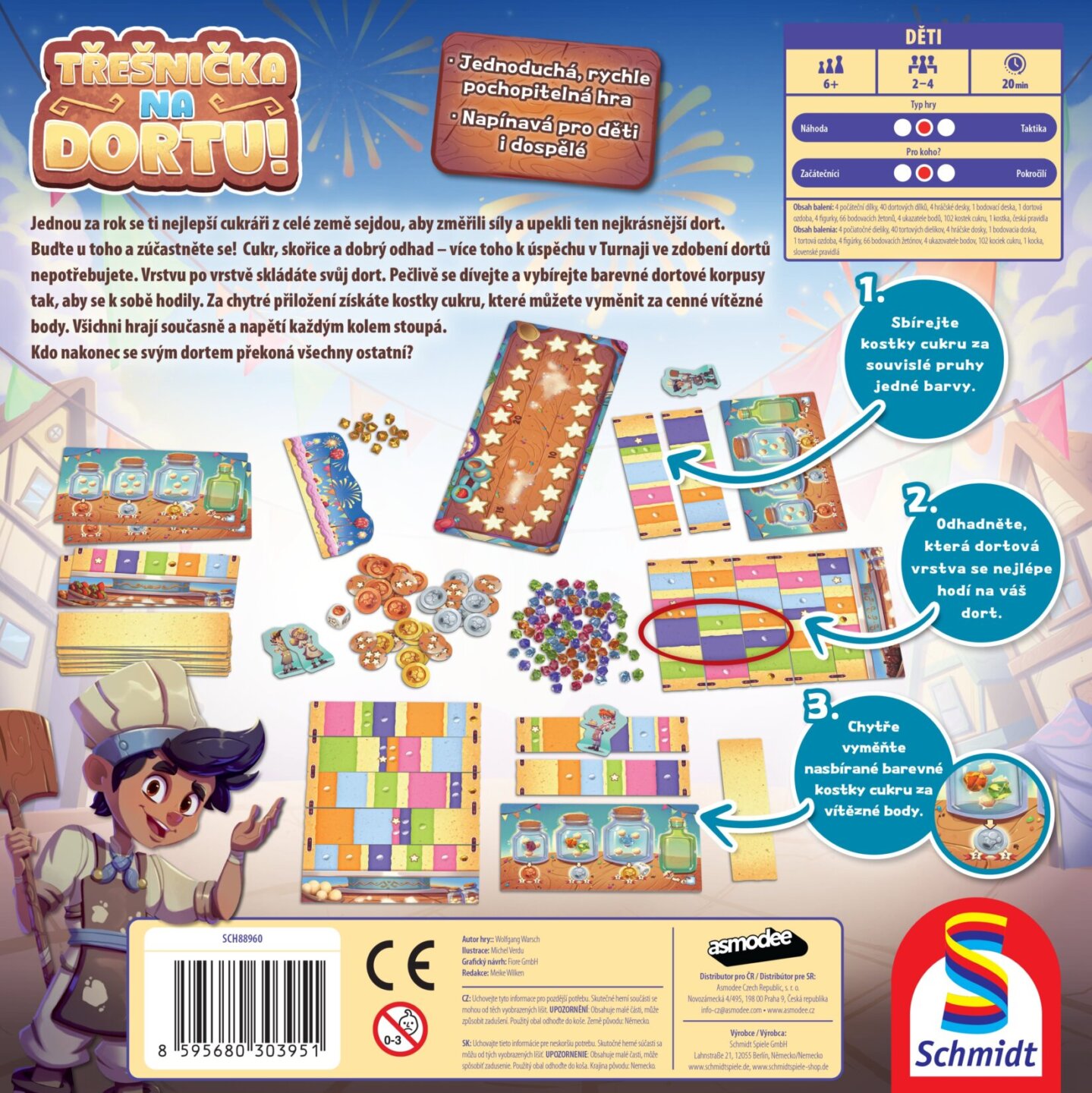 ostatní? - Sbírejte kostky cukru za souvislé pruhy jedné barvy. - Odhadněte, která dortová vrstva se nejlépe hodí na váš dort. - Chytře vyměňte nasbírané barevné kostky cukru za vítězné body. Proč byste si měli hru koupit - Jednoduchá pravidla umožní hrát hru i s menšími
