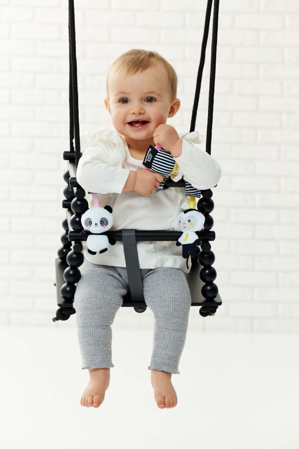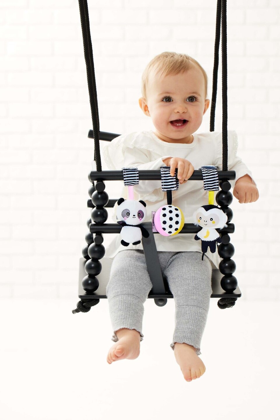 Závěsná plyšová hračka GaGaGu má kontrastní barvy a vzory, které stimulují zrak dítěte. Plyšové prvky - opice, panda a míč - a stuhy vybízejí děti, aby je uchopily a podpořily tzv. jemnou motoriku (pohyby prstů a rukou) a učení motorické koordinace. Pohodlný způsob