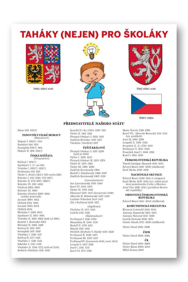 oblastí, od dělení chemických látek až po souhrn důležitých kyselin, od výpočtů a informací o hmotnosti a hustotě až po měření síly, od přehledu římských číslic až po stručný přehled geometrie – prostě vše, co pro osvojení českého jazyka, matematiky, dějepisu,