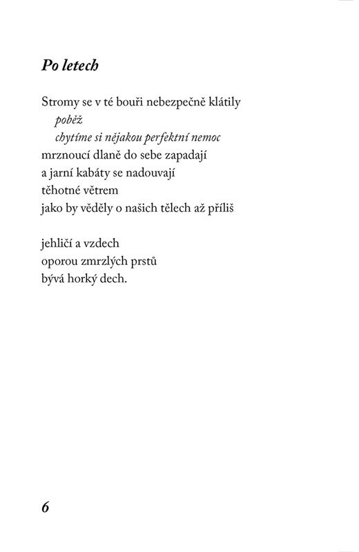 Jaké jsou borovice, když sněží? Jaký je to pocit, když se k nám sklánějí? Zpověď ženy a její pohled na každodenní, ale i nevšední okamžiky života, jako je smrt někoho blízkého nebo narození dítěte. Ve sbírce se cyklí několik ústředních motivů, Irsko, oceán, Vincent van Gogh a keramika. Básně...