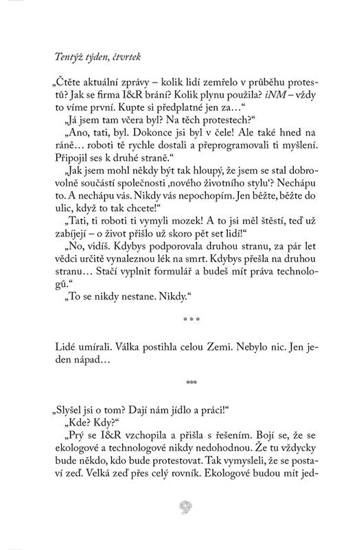 Dva odlišné názory – jedno řešení. Šestnáctiletá Sofie, nespokojená se životem na ekologické straně, touží poznat, co se skrývá za Velkou zdí. Jak to u technologů asi vypadá? Létají do vesmíru na výlet, nebo všichni zahynuli? Když se v jejím společenství objeví záhadná žena, Sofie spatří...
