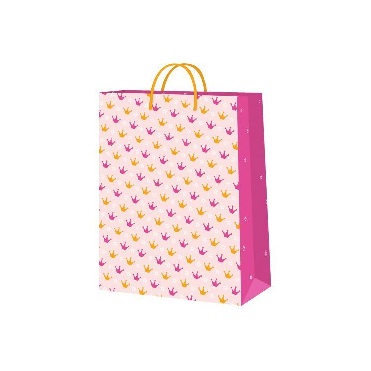 Papírová dárková taška s motivy princeznovských korunek a hvězdiček. Rozměry: 17,8 × 9,8 × 22,9 cm (šířka × hloubka × výška)