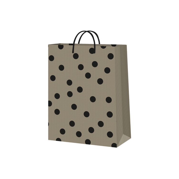 Hnědá papírová dárková taška s černými puntíky. Rozměry: 17,8 × 9,8 × 22,9 cm (šířka × hloubka × výška)