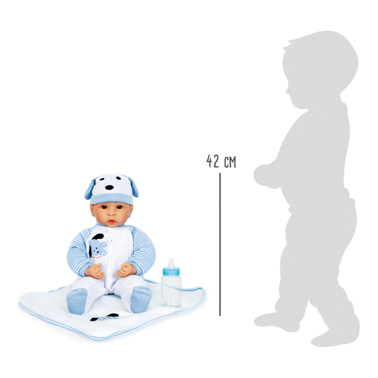 Malý Beno je velký milovník psů. Panenka má nasazenou čepičku a dupačky s roztomilým modro-bílým motivem štěněte. Balení zahrnuje kojeneckou lahvičku, dudlík, který se dá vložit do pusy, a měkkou přikrývku. Hlavní vlastnosti: obsahuje oblečení, kojeneckou láhev, dudlík a měkkou...