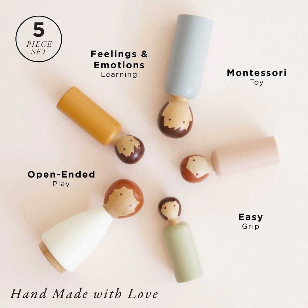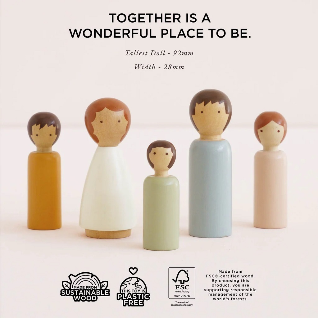 jemnou motoriku a sociální interakci. Hlavní vlastnosti: 5 kusů dřevěných panenek skutečná rodinka, ideální pro domeček, malé světy nebo volnou hruFSC® dřevo a ekologické barvy minimalistický a neutrální design podpora kreativity a imaginace, děti mohou panenkám přiřazovat