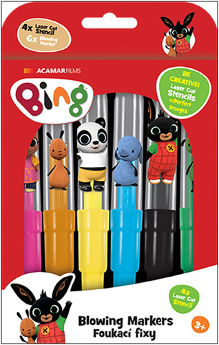 Balení obsahuje 6 barevných foukacích fixů a 4 barevné papírové šablonky v oblíbených pohádkových motivech.