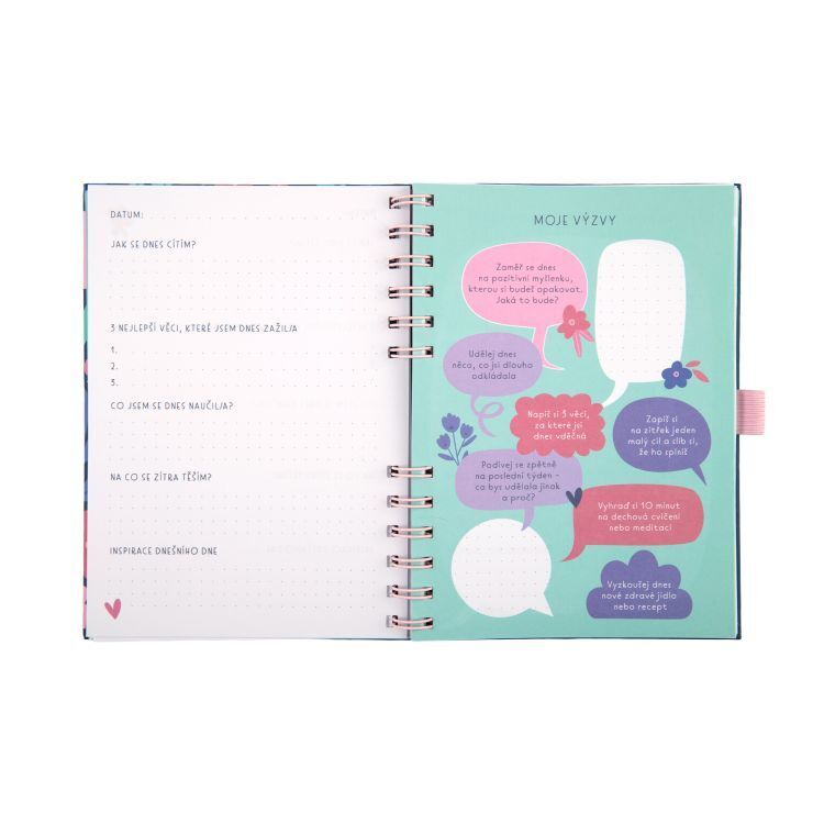 Kompaktní 5minutový deník s kroužkovou vazbou je jednoduchý a efektivní nástroj pro každodenní sebereflexi. Součástí je i set samolepek. Rozměry deníku: 15 × 19,5 × 1,8 cm