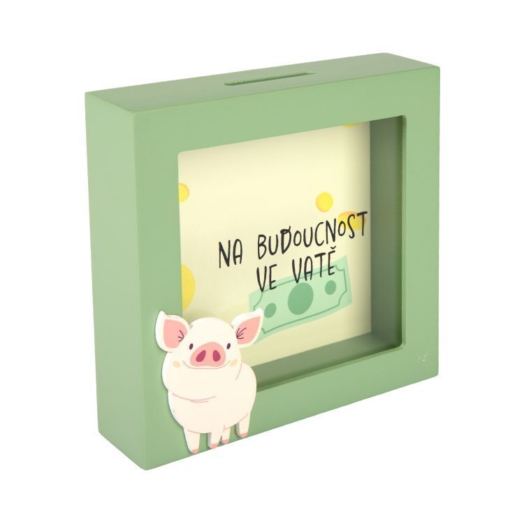 3D pokladnička v rámečku pro všechny šetřílky. Přední stranu rámečku zdobí roztomilé prasátko, zadní stranu pokladničky motiv peněz. Rozměry pokladničky: 15 ×15 × 4 cm