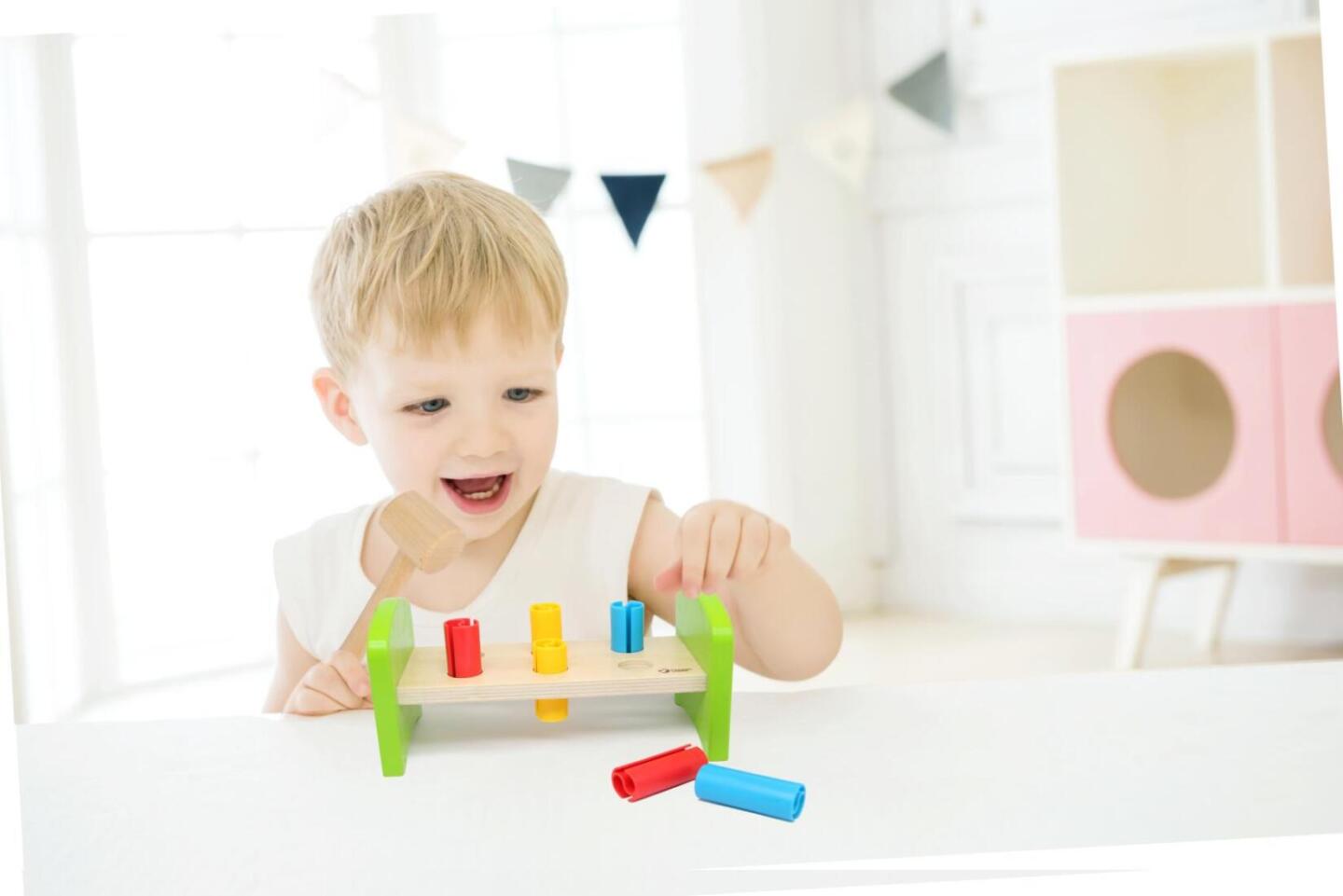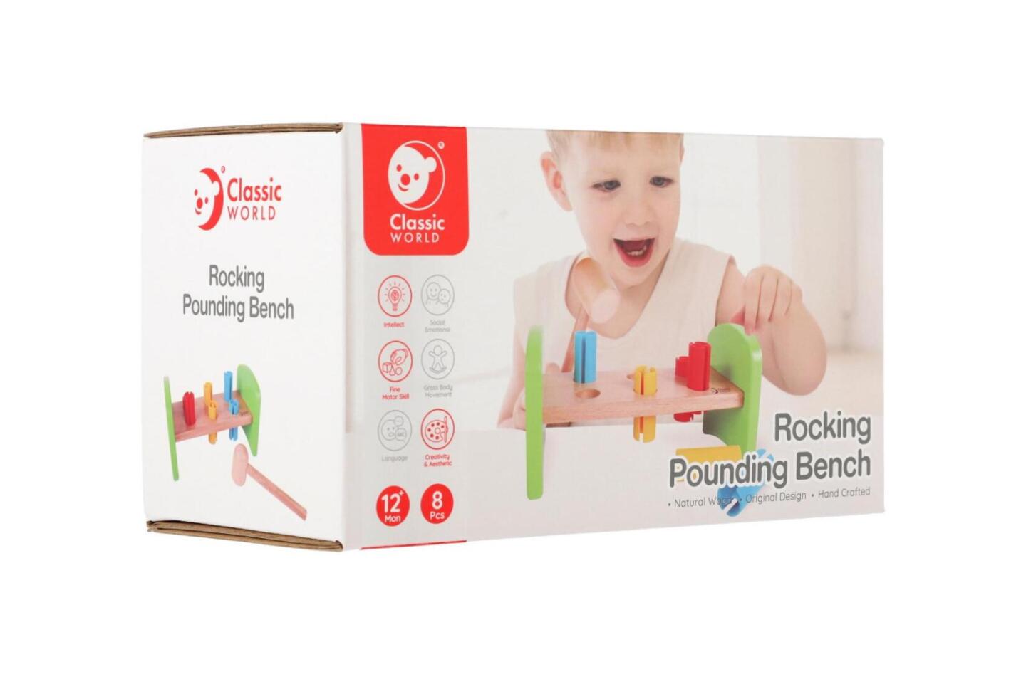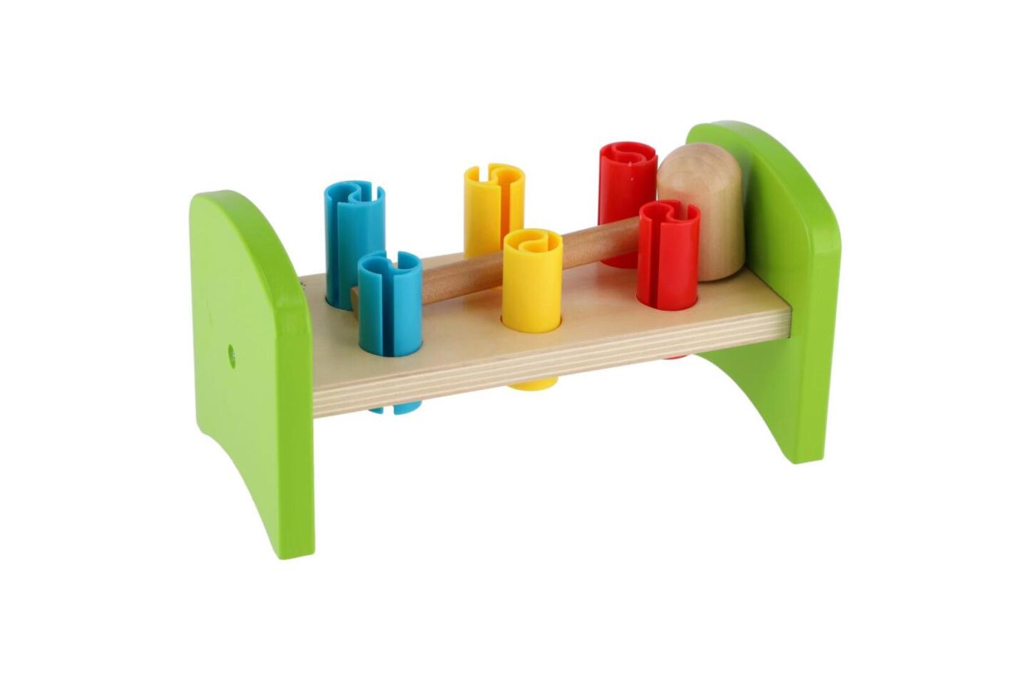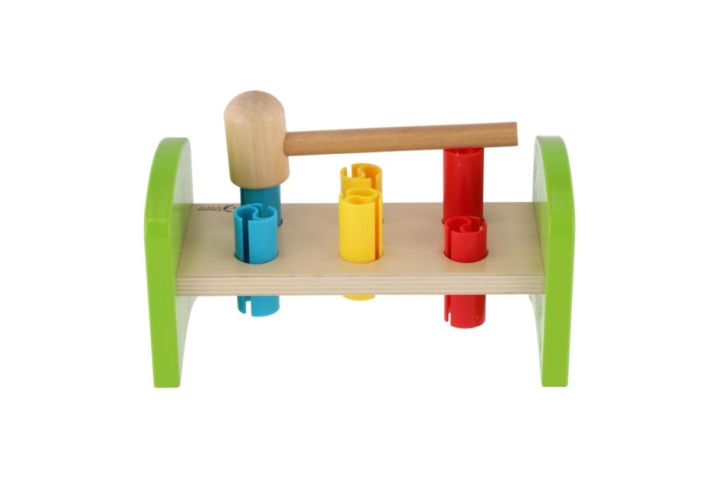 Dřevěná zatloukačka s kladívkem ve veselých barvách je skvělá hračka pro malé kutily, kteří se chtějí podobat svému tatínkovi. Balení obsahuje zatloukačku, kladívko a 6 ks plastových barevných kolíků. Hračka rozvíjí jemnou motoriku rukou. Užívejte spoustu zábavy s touto, z jedné strany stabilní...