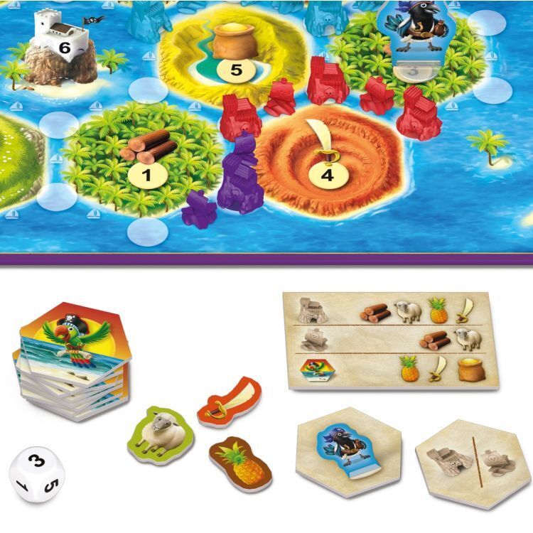 28 lodí, 28 doupat, 90 žetonů zásob, 16 kartiček s papouškem, 4 přehledové karty, kostku a pravidla. Autor hry: Klaus Teuber