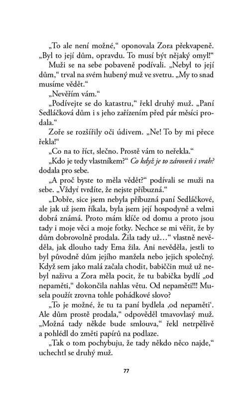 Zora je rozvedená matka hyperaktivního chlapce, se kterým to nemá snadné. Pomáhá jí mimo jiné i „babička“ Sedláčková, která ji hlídala, když byla malá, a zůstaly si blízké až do Zořiny dospělosti. Místo obvyklé návštěvy přijde jednou šok – Zora najde Emu Sedláčkovou mrtvou na poli za jejím...