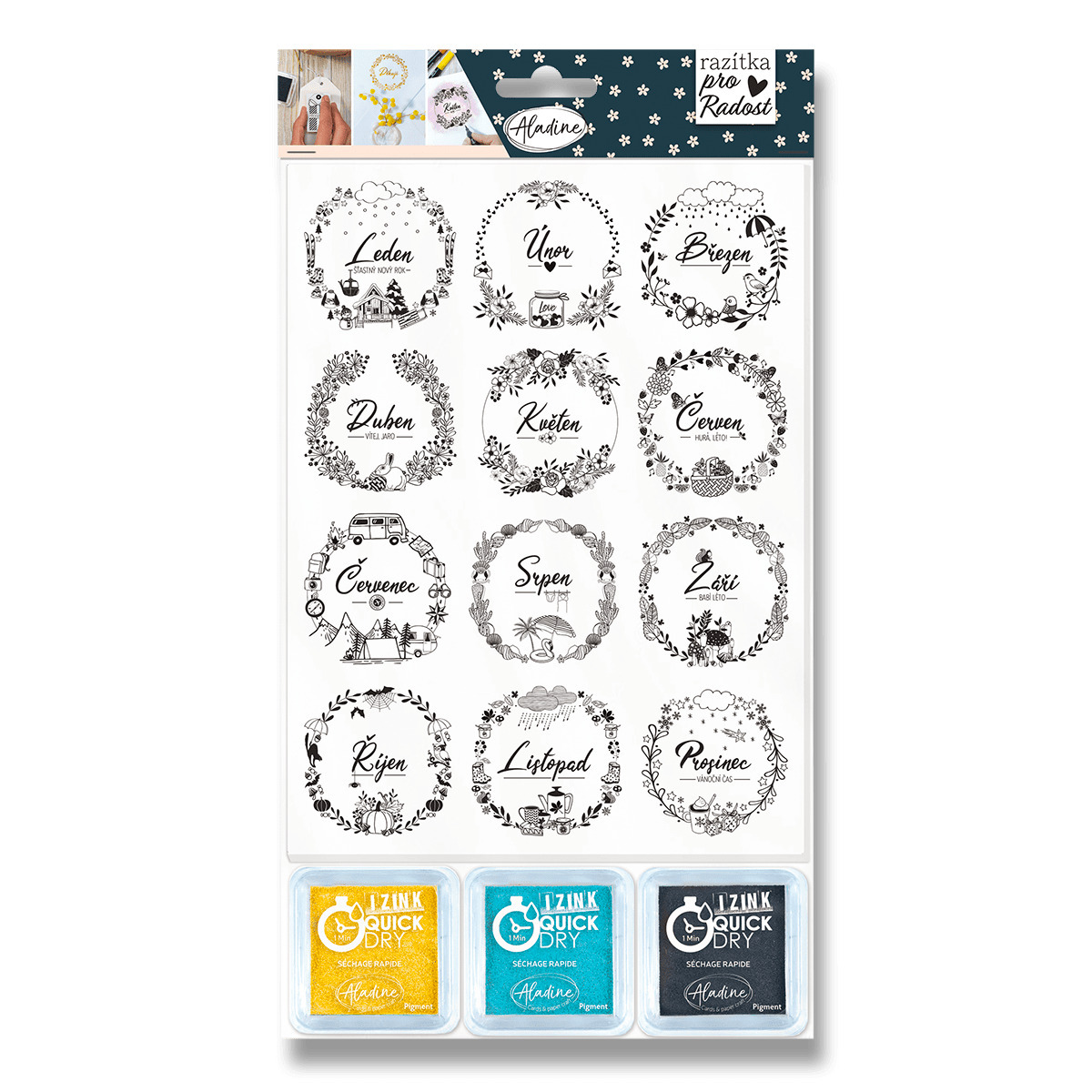 pro lepší přehlednost i snažší skladovatelnost. Razítka mají hlubokou texturu, hodí se tak kromě tradičního potisku papíru také do keramických, polymerových a jiných hmot. Motivy vynikají i na dřevě nebo textilu. Sada obsahuje 12 ks razítek a 3 barevné razítkovací