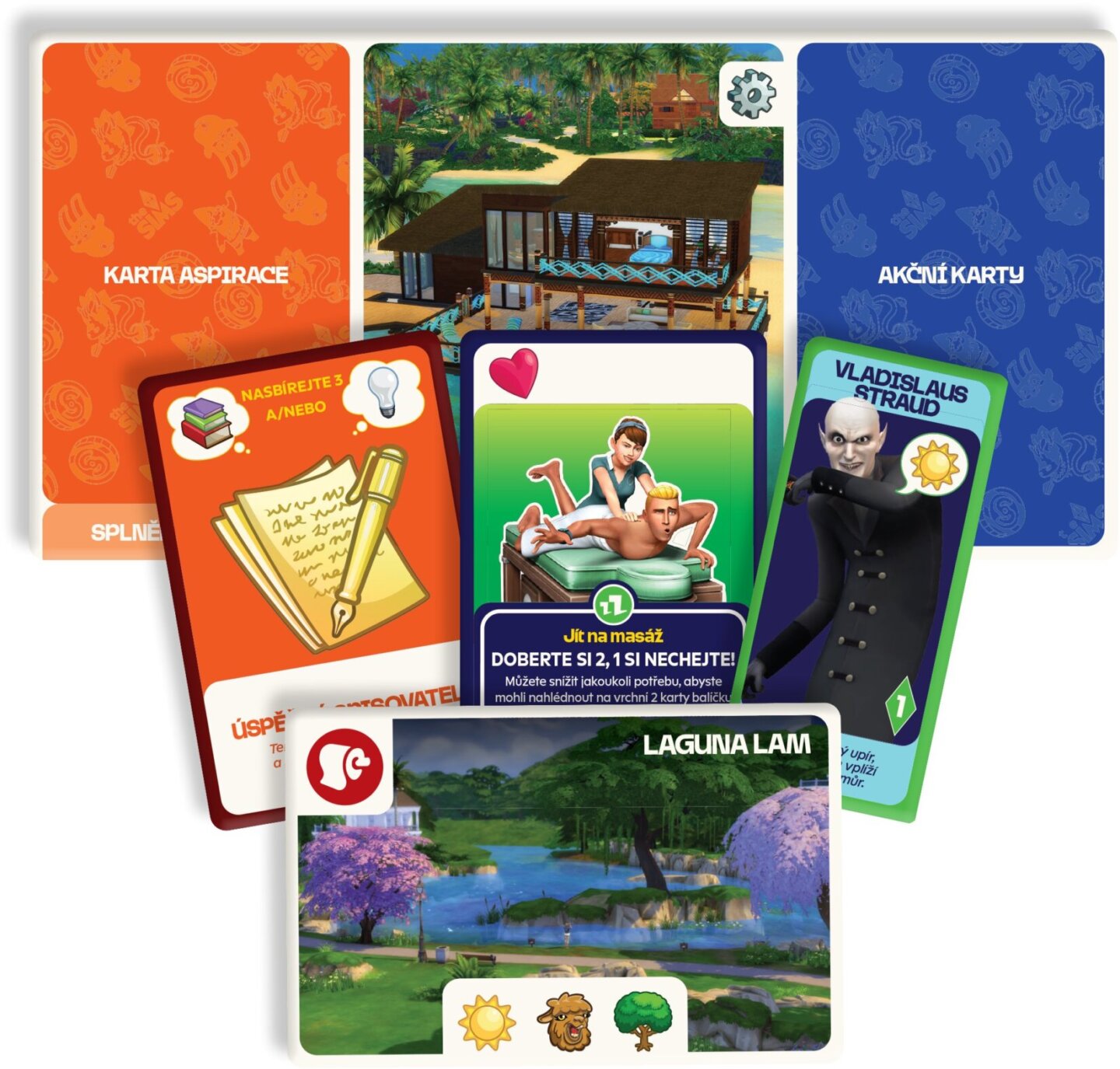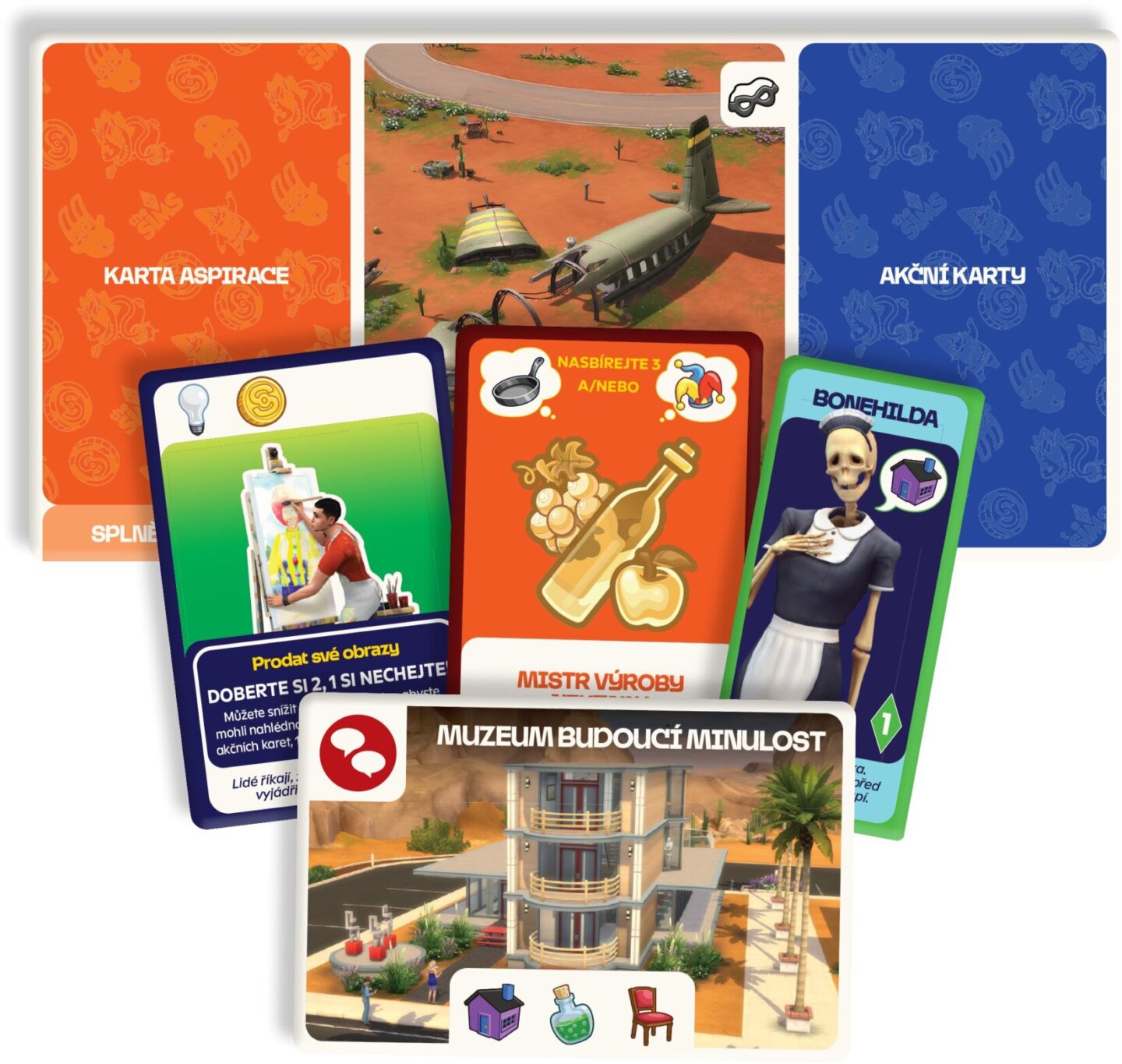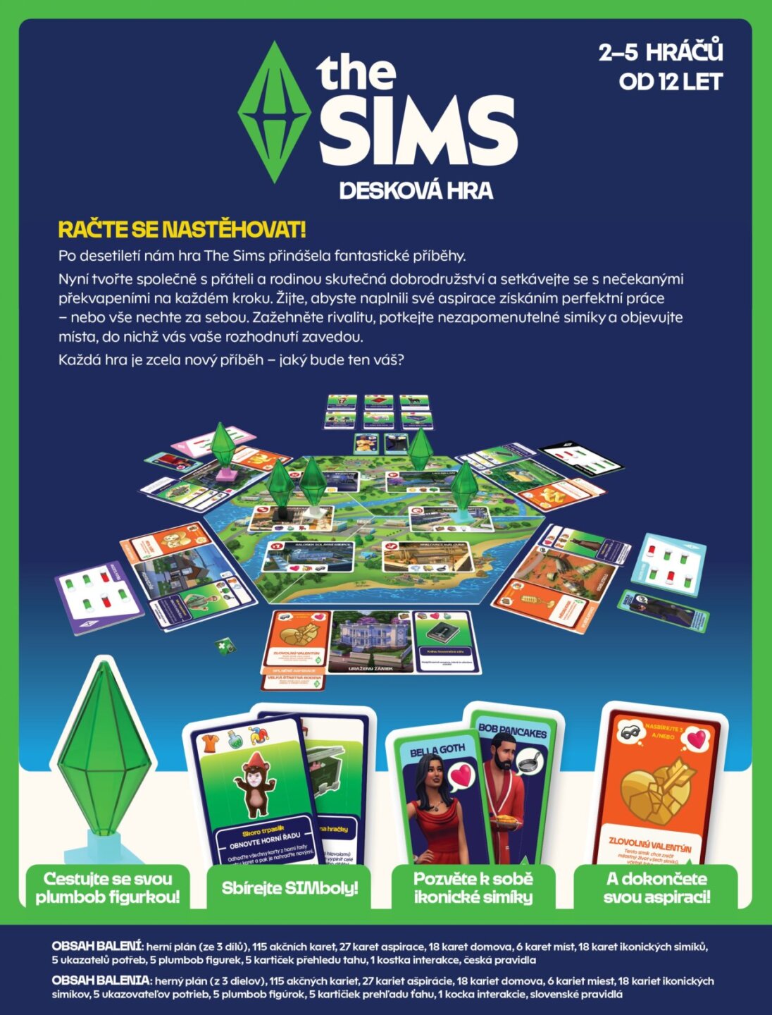 působí přirozeně a blízce fanouškům všech generací. Obsah balení: herní plán (ze 3 dílů) 115 akčních karet 27 karet aspirace 18 karet domova 6 karet míst 18 karet ikonických simíků, 5 ukazatelů potřeb 5 plumbob figurek 5 kartiček přehledu tahu 1 kostka interakce česká a