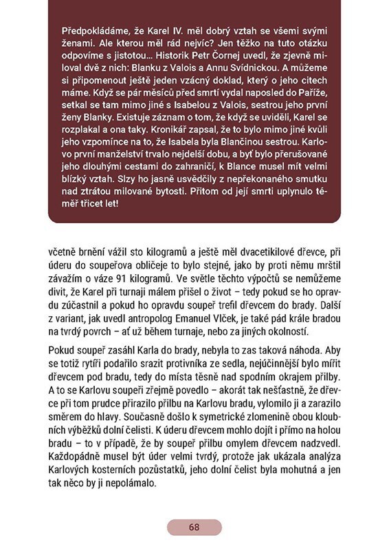 Jaké byly porody mladé císařovny Sisi? Jak se asi starali o Karla IV., když byl po úrazu několik týdnů nehybný? Jak Marie Terezie vychovávala svoje děti a měla opravdu nejradši dceru Marii Kristinu? Jaký byl Franz Josef šéf... a milenec? Sžil se Jan Lucemburský se svou slepotou? A co prožívala...