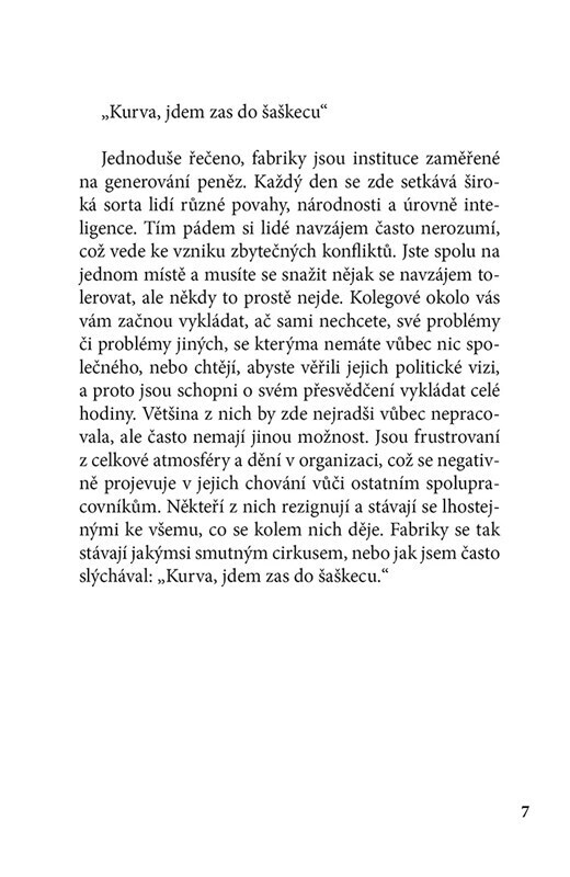 Nekompromisní, drsný a groteskně vtipný pohled do života lidí ukrytých za zdmi výrobních hal. Seznamte se s postavami, které byste si za své kolegy sami nevybrali – s Dědkem, jenž dokázal obelstít systém i šéfa a prozradí, jak na správnou masáž prostaty, s panem Romadurem, k němuž se nelze...