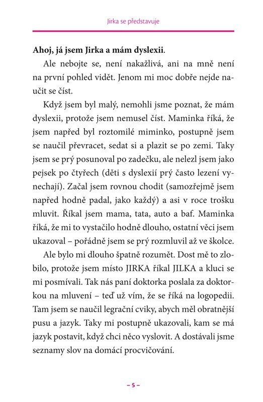 Publikace je určena dětem ve věku od 6 do 12 let, které mají potíže s dyslexií, a také jejich rodičům, učitelům nebo kamarádům. Knihou provází chlapec Jirka, který trpí poruchou čtení. Školák se vyprávěním o sobě a svém každodenním životě snaží přiblížit problémy, se kterými se děti s dyslexií...