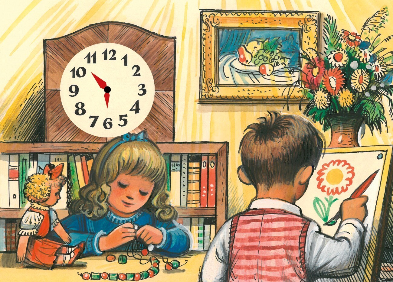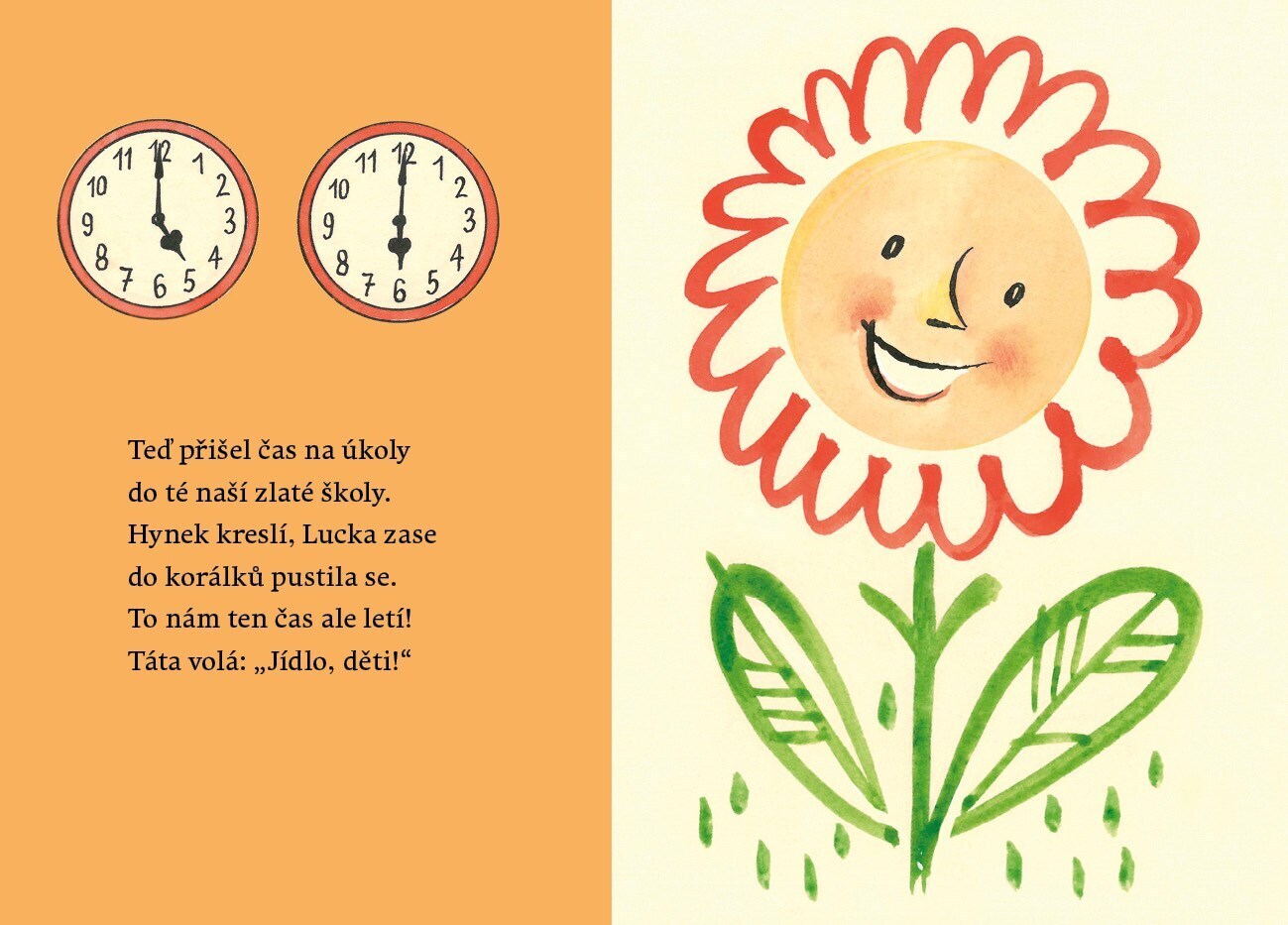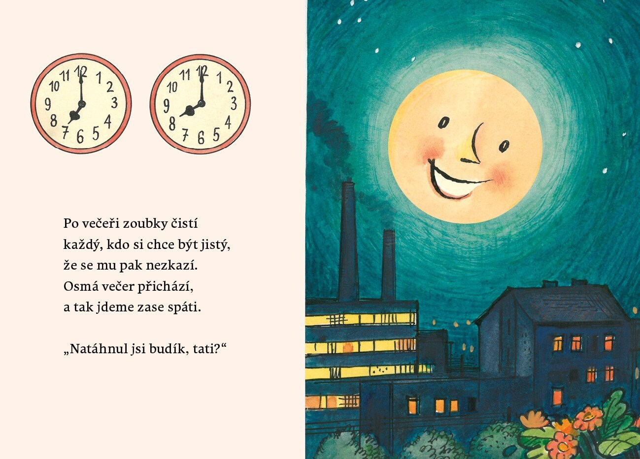 Dětský den od sedmi do sedmi je plný velkých dobrodružství. Dokazují to půvabné verše předního českého básníka Radka Malého i ilustrace geniálního výtvarníka Vojtěcha Kubašty. Součástí knížky jsou i opravdové hodiny s posuvnými ručičkami, díky kterým se každý malý čtenář může naučit, jak se měří...