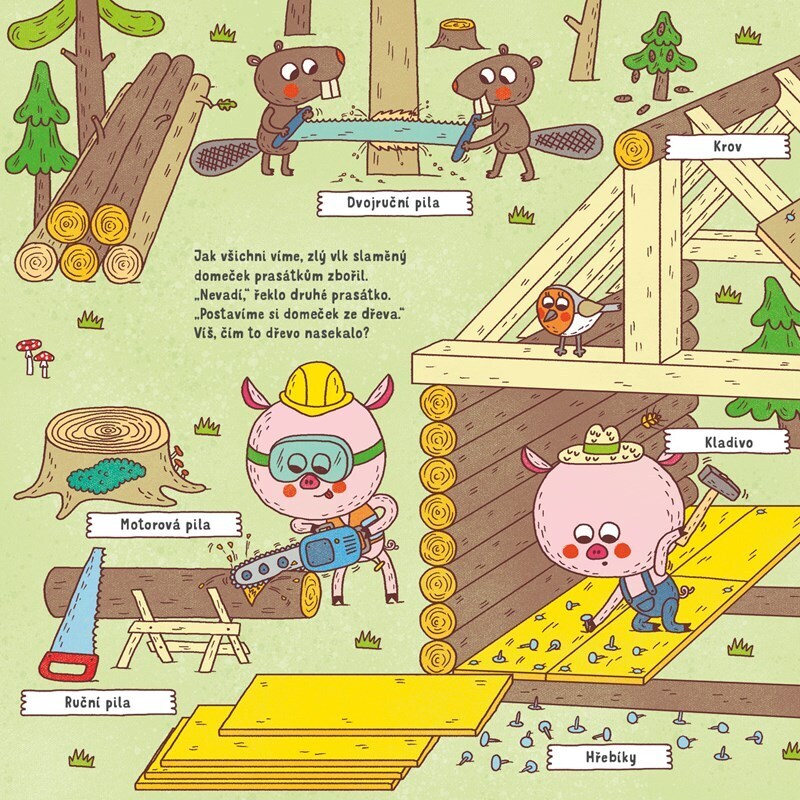 Tři prasátka si chtěla postavit domeček. Ale jak se vlastně takový domeček staví? Oblékni si montérky a podívej se, co všechno prasátka potřebovala: jeřáb, bagr, krumpáč, nákladní auto, cihly, zednickou lžíci… Kdo jim pomáhal a jakou zvláštní věc našla prasátka hluboko v půdě? To se dozvíš v...