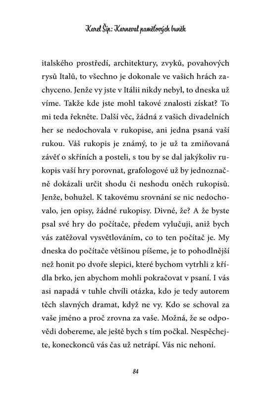 Oblíbený moderátor a bavič Karel Šíp s nadhledem sobě vlastním představuje témata, která ho zajímají, o kterých debatuje se svými televizními hosty nebo jež vyplavila zákoutí jeho paměti. Dočtete se například, jaké geny zdědil po svém tatínkovi, jakou hodnotu má autogram nebo proč mu řidiči...
