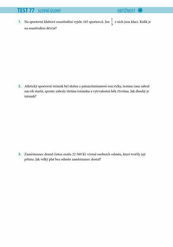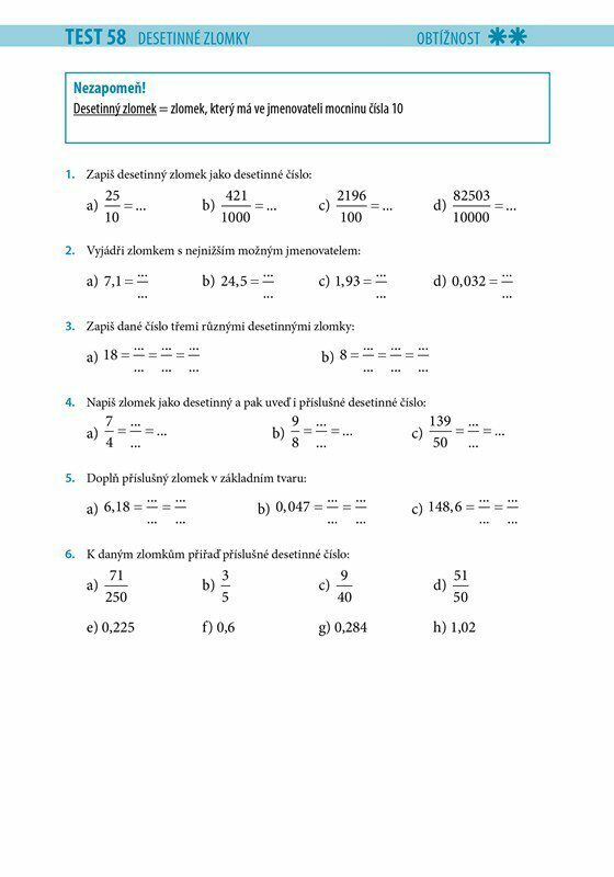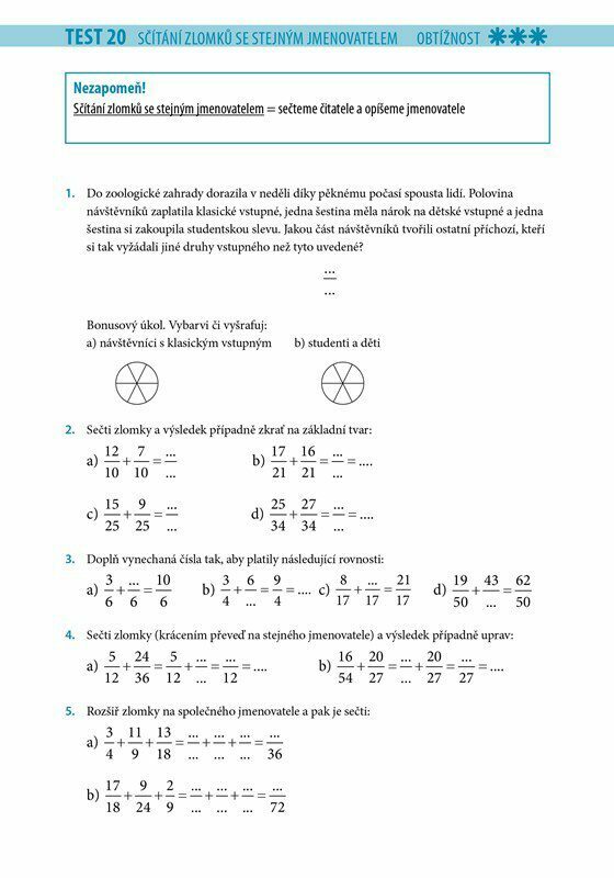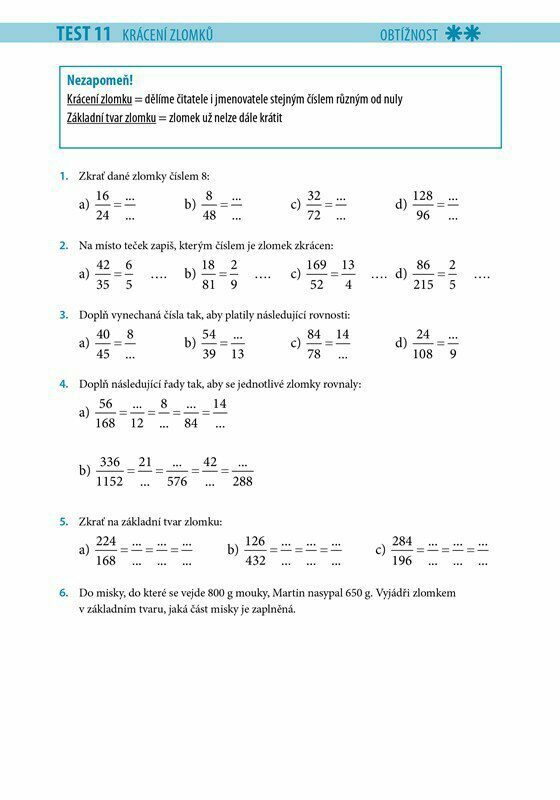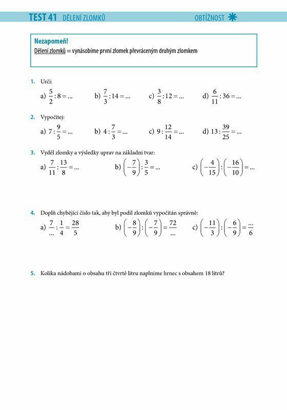 V dalším svazku Desetiminutovek najdete 88 minitestů v logickém a přehledném pořadí. Rozšiřování, krácení, porovnávání zlomků, počítání se zlomky se stejným i rozdílným jmenovatelem, slovní úlohy a mnoho dalšího, to vše ve třech různých obtížnostech. Vytrhněte list a počítejte, nebo počítejte a...