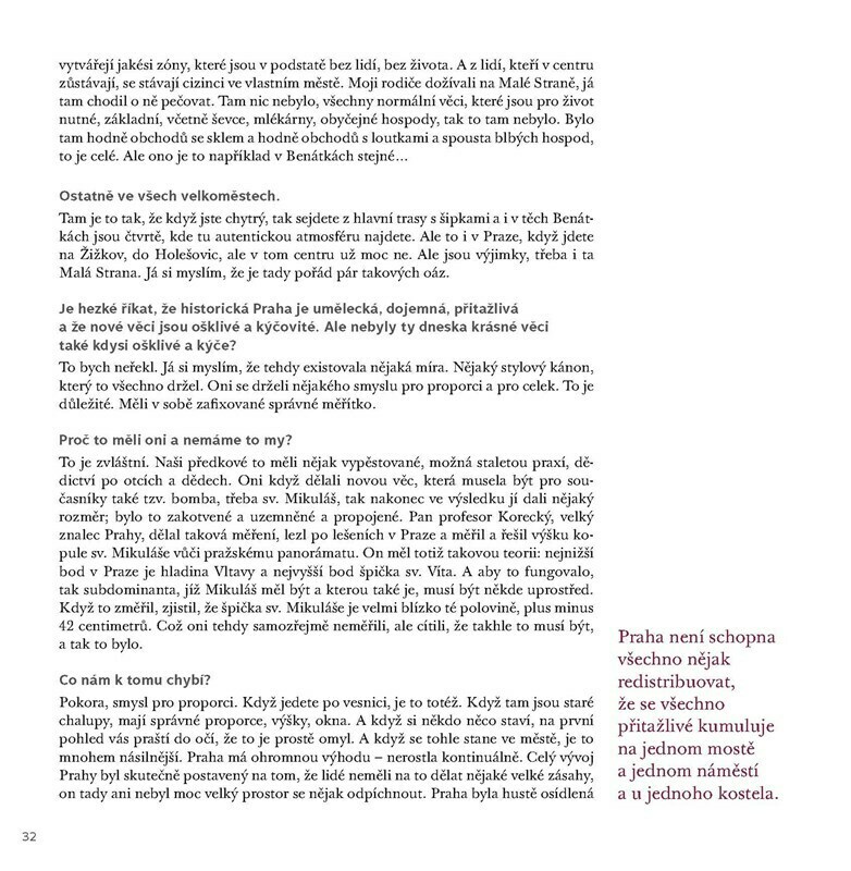 Tato kniha, ač plná fotografií, je uprostřed mnoha publikací o metropoli ojedinělá. Představuje rozhovory s vynikajícími odborníky, kteří z hlediska svých profesí město hodnotí a upozorňují i na nebezpečí, která mu hrozí. V době, kdy Výbor světového dědictví UNESCO ohlásil možné vyškrtnutí Prahy...