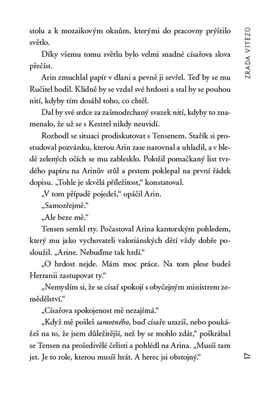 Kestrel svolila ke sňatku s korunním princem a zajistila tak herranskému lidu svobodu a územní autonomii. Sama se však ocitla ve zlaté kleci císařského paláce. Svoje nové postavení ovšem hodlá maximálně využít. Chce změnit kruté válečné taktiky svého národa, a tak se bez Arinova vědomí stává...