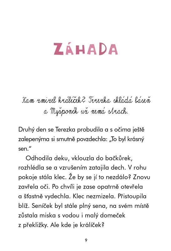 Terka je jedináček, takže když dostane za vysvědčení malého králíčka, je nadšená. Konečně bude mít doma živého kamaráda. Starat se o zvířátko ale není jen tak. Bude se muset naučit, co může jíst, vymýšlet mu zábavu, cvičit ho a postarat se o něj i ve chvílích, kdy onemocní. Terka je ale šikulka...