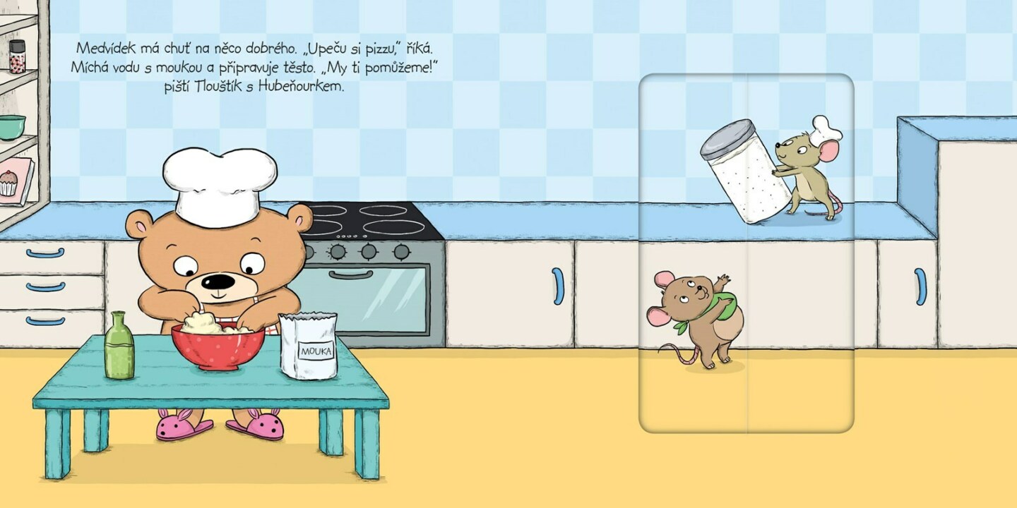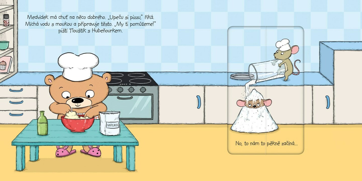 To je ale dvojka! Jedna je hubená jako lunt a druhá nemá daleko do kuličky. Dvě myšky, které obvykle u medvídka doma dělají jen samou neplechu, se rozhodly, že mu tentokrát pomůžou. S medvídkem upečou vynikající pizzu! Se sladkou rajčatovou omáčkou a se sýrem, ten mají nejradši. Co myslíš,...