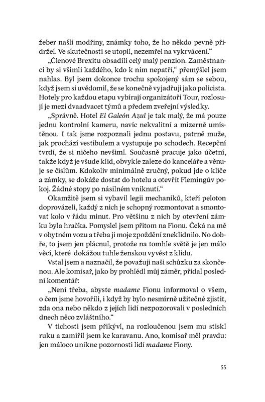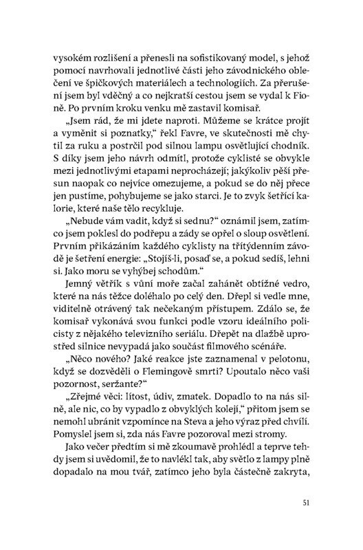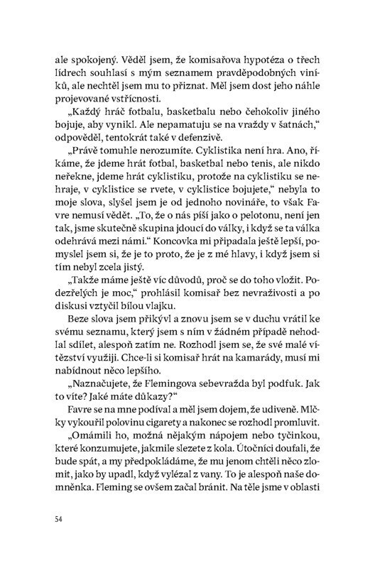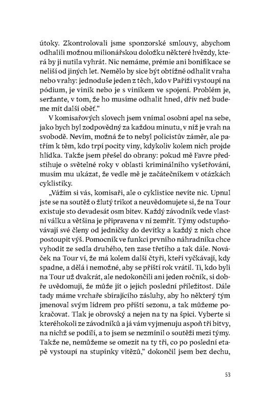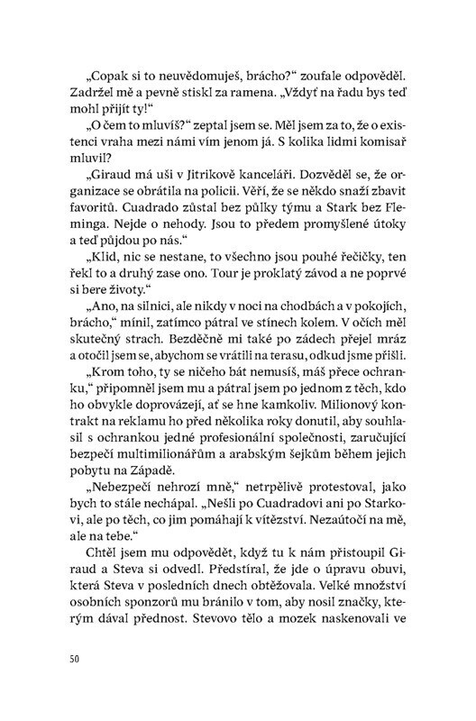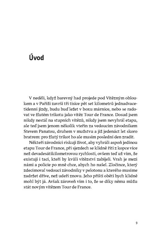 Profesionální závodník s vojenskou minulostí je členem jednoho z týmů na Tour de France. Po sérií podezřelých nehod se na něj obrátí policie s prosbou o pomoc. Je možné, že se mezi závodníky či v jejich těsném okolí pohybuje vrah? Podle nadšených recenzí dělá Zepeda touto knihou pro závodní...