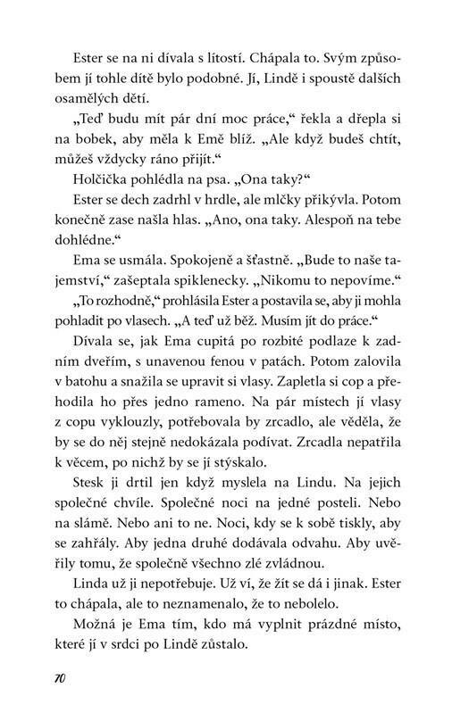 Ester právě bylo osmnáct, je bez domova a za sebou má minulost, na kterou nechce vzpomínat. Vrací se do míst, kde žila jako malá holka s mámou a sestrou. Má k tomu svůj důvod, ale netuší, jestli jí to přinese naději nebo zklamání a další bolest. Holka bez rodiny to nemá snadné. Je možné, že by...