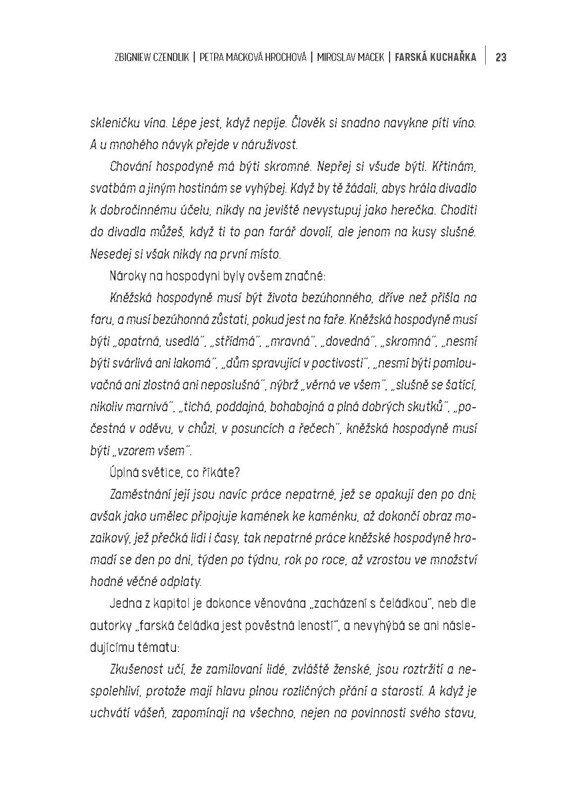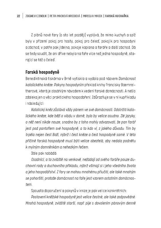Tato kniha není jen prostou kuchařkou, tedy souborem receptů, ale je též knihou k poučení o církevním roku a jeho vlivu na jídelní zvyklosti předků, o životě farářů a farských hospodyň, a to obzvláště na venkovských farách, a též o sepětí tehdejšího jídelníčku s ročními obdobími a dostupnými...