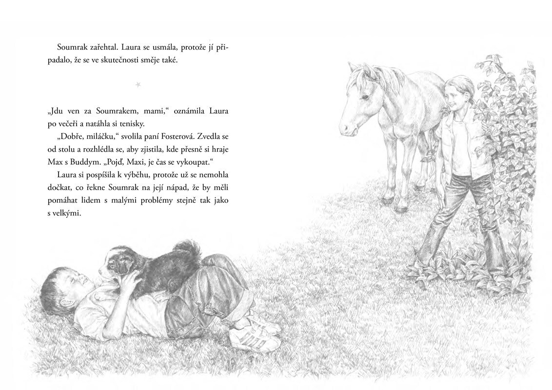 Soumrak sice většinu času vypadá jako obyčejný poník, ale pokaždé když Laura pronese slova tajného zaříkadla, promění se v kouzelného jednorožce a společně pak létají po světě… Při jedné z večerních projížděk se Soumrak začne cítit nemocně, a tak se s Laurou musí nečekaně vrátit domů. Když se...