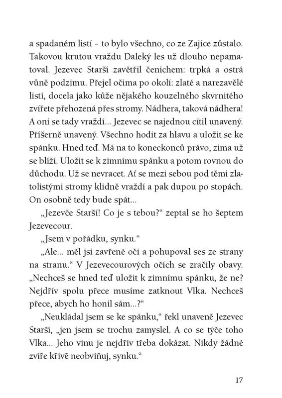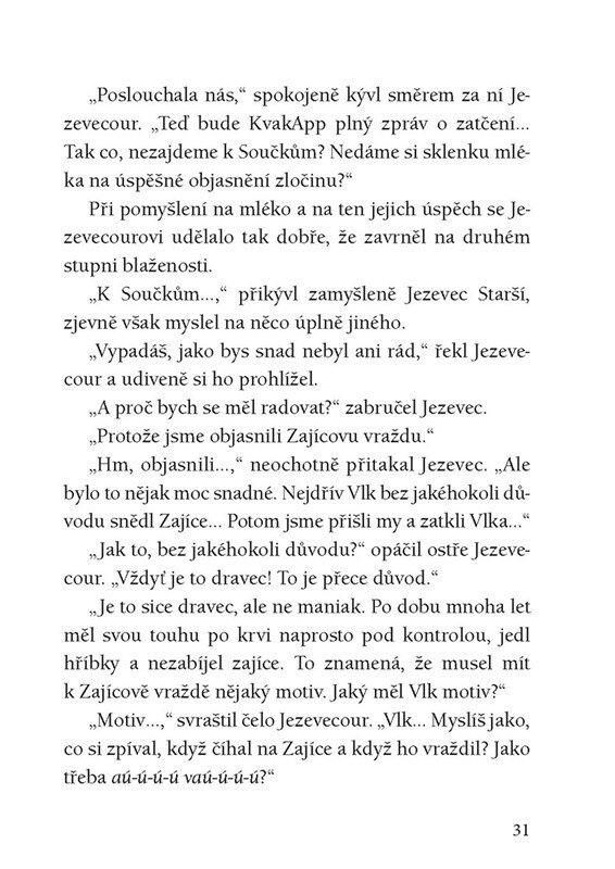 Chtěl, aby v Dalekém lese už konečně někdo spáchal skutečný zvířecí zločin. Všech těch drobných přestupků měl až po krk. Koho zajímá krádež cedrové šišky, neuklizený trus na pasece nebo vyškubnuté pero z ocasu? A teď se to stalo! Vražda! Truchlící vdova, hamižní advokáti, svědkové, podezřelí…...