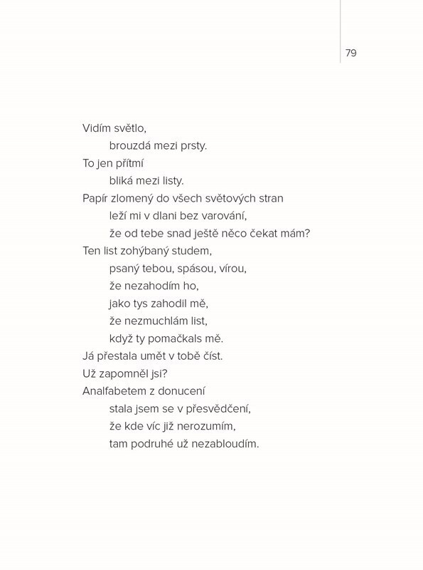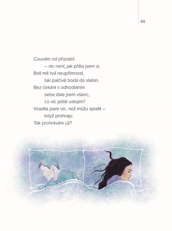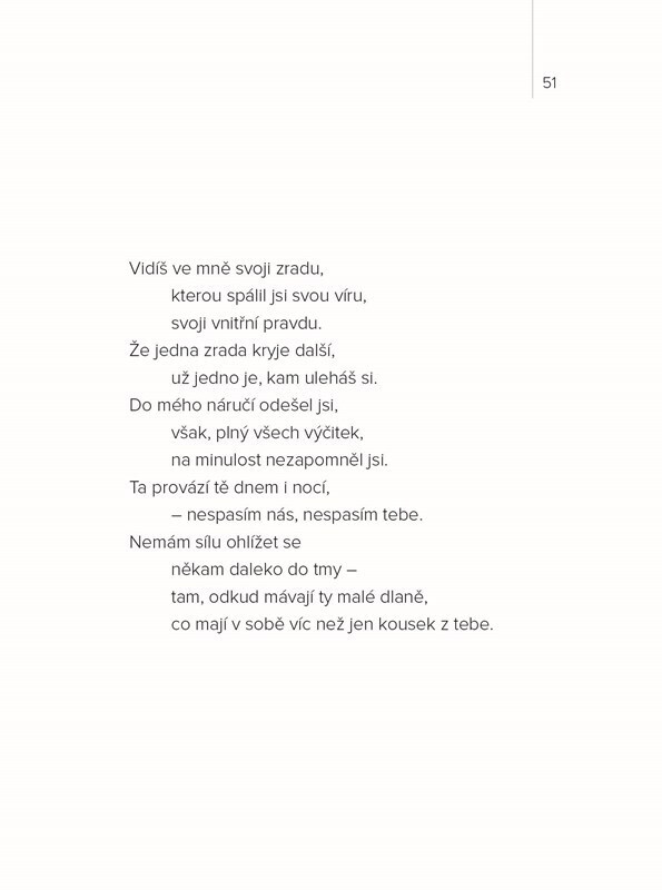 Vyměnili si pohled. Byl krátký, těžko by si ho byl někdo všiml. Nikdy předtím se neviděli, ale ona už ve svém srdci nedokázala vidět nikoho jiného. Ve verších ukrytý příběh o boji se zakázanou láskou, o zradě, slibech, odpovědnosti i strachu. O tom, jak hledání sebe samé prostřednictvím mužské...