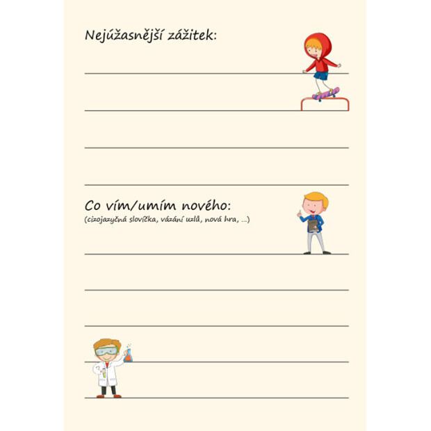 zapisování a hodnocení zážitků, přečtených knih, použitých dopravních prostředků či letního počasí. Součástí deníku je arch barevných samolepek pro rozvoj kreativity.