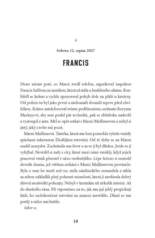 V temných uličkách Brightonu kdosi napadl mladou ženu. Zranění se zprvu nezdají vážná, ale oběť za 24 hodin umírá v agónii a na jejím těle se najde smrtící tetování. Po zmizení druhé ženy už inspektor Francis Sullivan ví, že čelí sériovému vrahovi. Jedno ale nečekal: hlavním podezřelým je Alex...