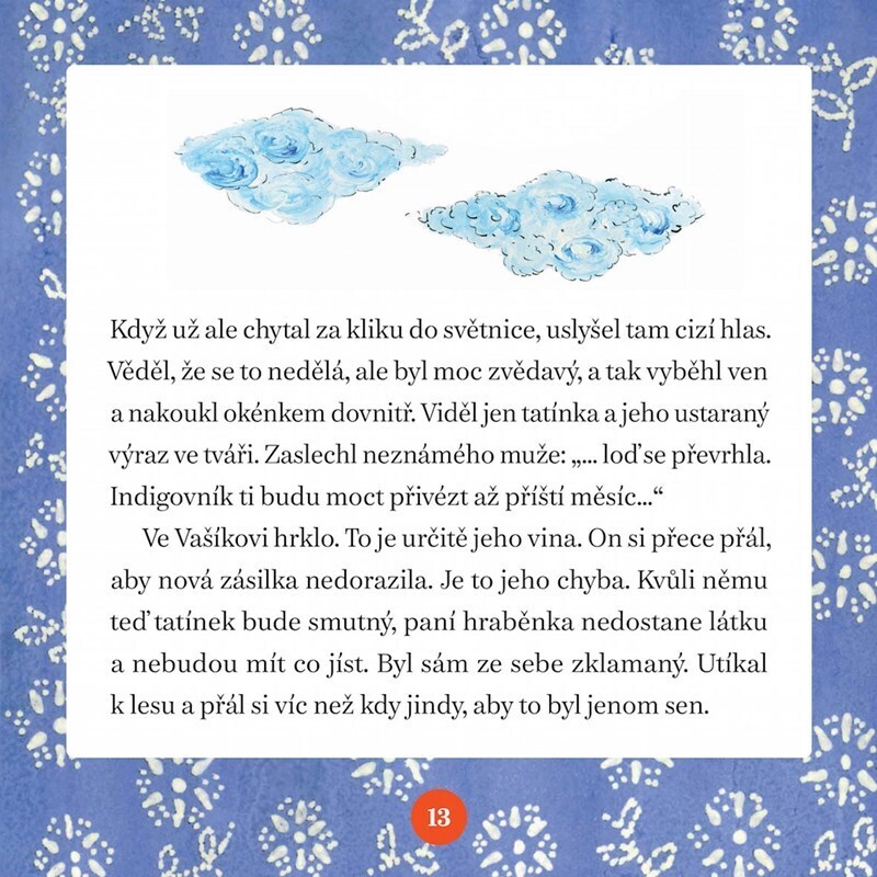 Vašíkův tatínek je barvíř. Jenže mu nedorazila dodávka indigovníku – a bez něj nebude žádný modrotisk! Co teď? Naštěstí se Vašík náhodou ocitne v modrobílém království, kde potká motýla modráska, modrého ježka Azura, vílu Rozárku a také princeznu Indigo. Ta mu přislíbí zásoby indigovníku, jen...