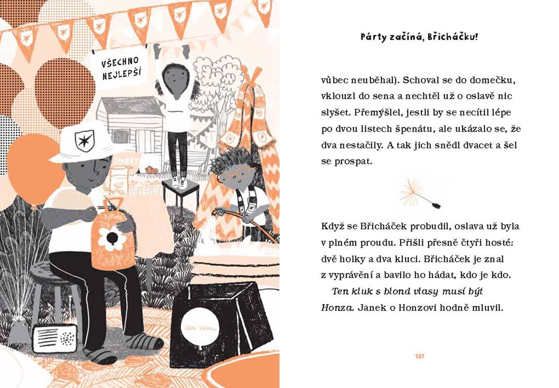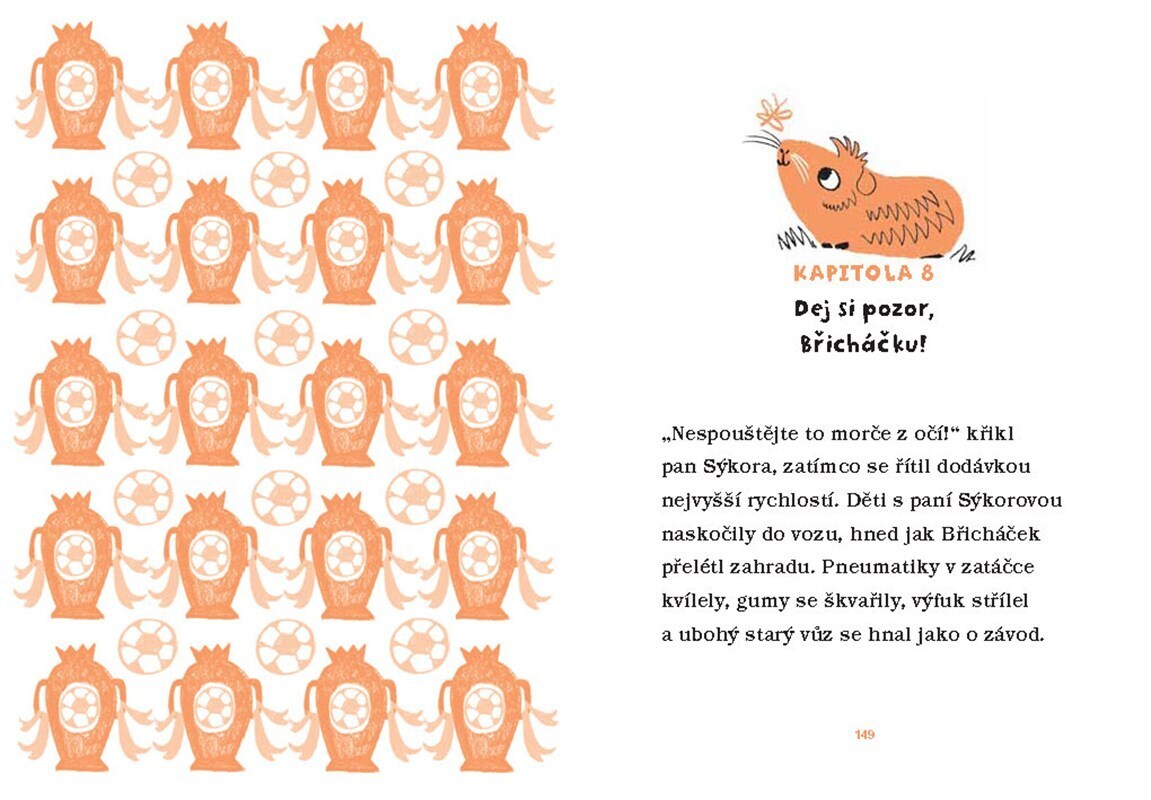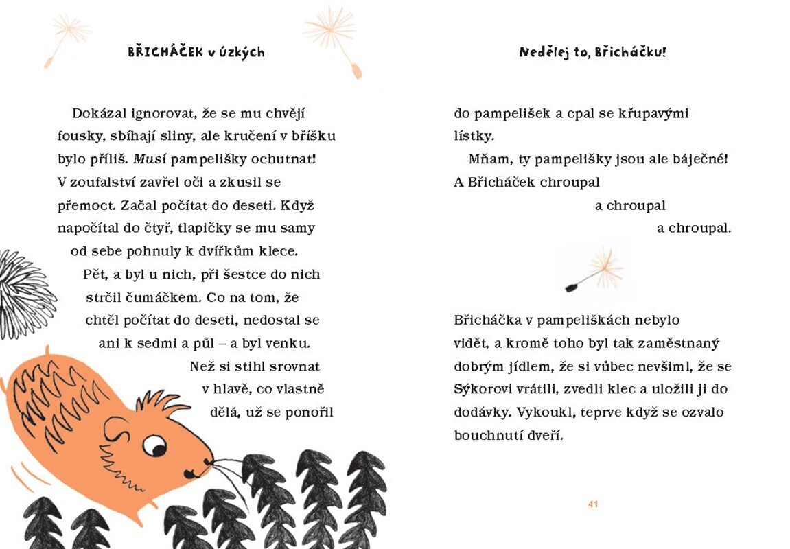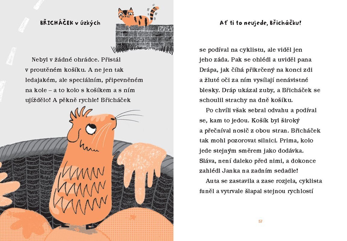 Břicháček je morče jako každé jiné. Nejradši chroupe mrkev nebo pospává ve svém doupátku. Případně si čte články o svém oblíbeném fotbalovém klubu FK Jiskry v novinách, co leží na dně jeho klece. To se však brzy změní… Čeká ho totiž stěhování do nového bytu! A tak Břicháček poprvé zažije...