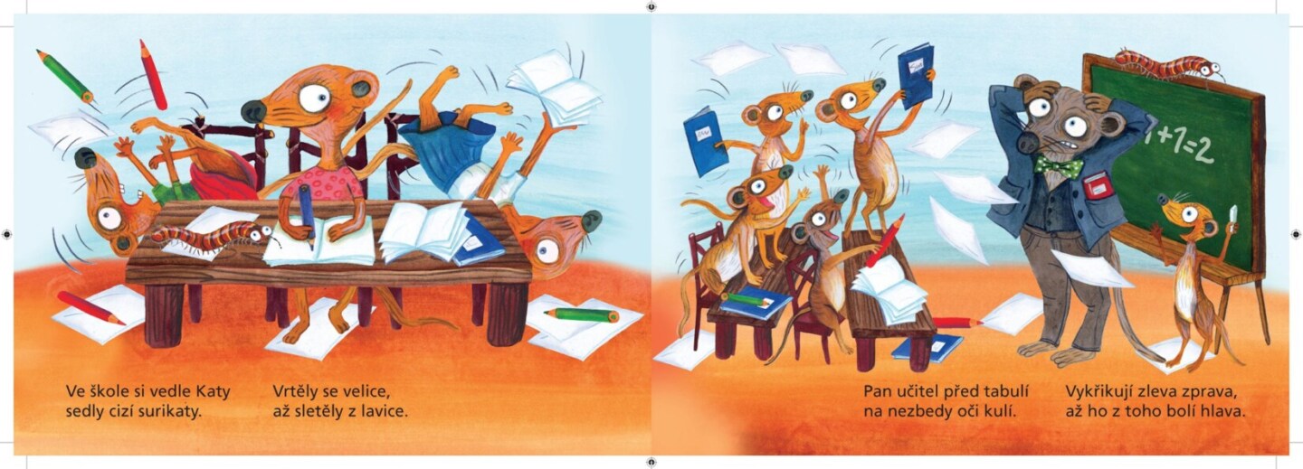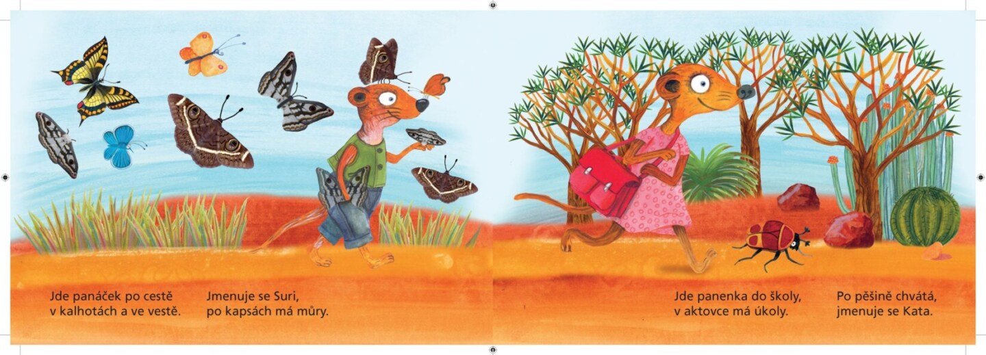 Veselé leporelo o šelmičkách surikatách. Děti se nejen pobaví vtipnými verši, ale dozvědí se i spoustu zajímavých věcí, například že když se surikaty vyhřívají na sluníčku, někdo z rodiny musí pořád dávat pozor. Pokud spatří nebezpečí, křikne a všichni se hned schovají do děr v zemi. Žijí na...