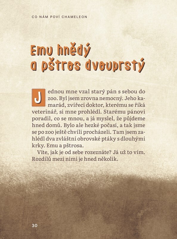Knížka Co nám poví chameleon je určena pro děti od šesti do sta let. Autorka a ilustrátorka Zora Koru nám představí víc než třicet úžasných obyvatel říše zvířat, kteří dokáží naprosto neuvěřitelné věci: ryby létající nad vodou, ještěry běhající po vodě nebo ptáky, kteří vůbec létat neumějí, zato...
