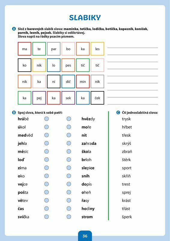 Kniha je určena nejmladším žákům přibližně od 7 let a nabízí řadu podkladů pro procvičení čtení a psaní. První část knihy se věnuje psaní, vnímání tvarů jednotlivých písmen a jejich porovnávání. Při čtení se klade důraz na porozumění textu a žáci jsou motivováni ke koncentraci pozornosti....